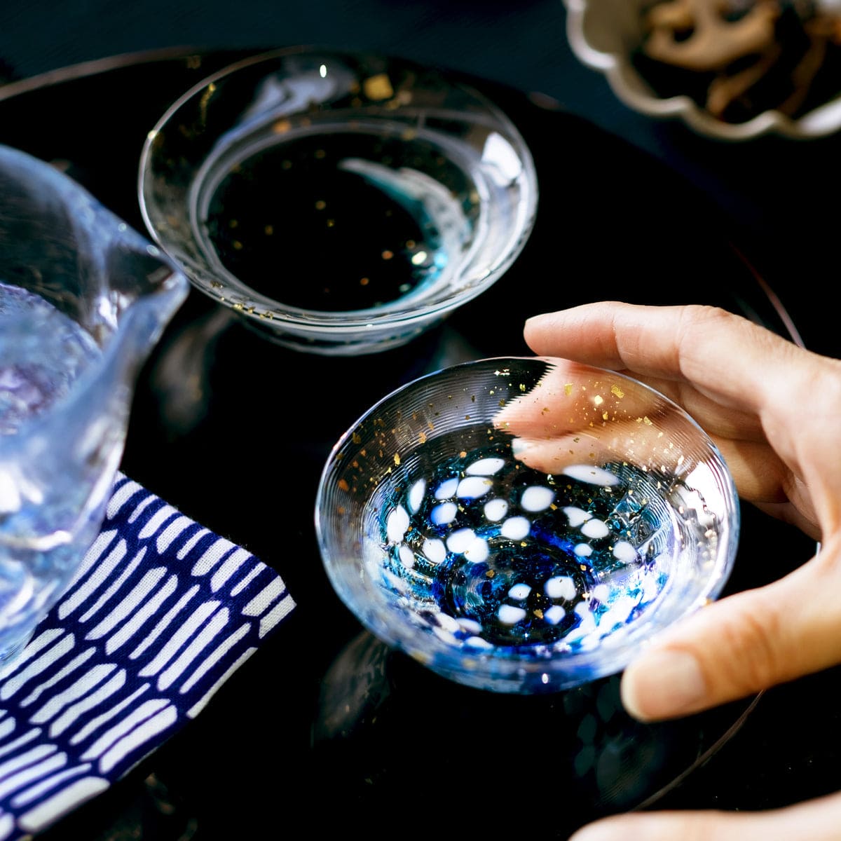 The Sayaka sake cup series reflects the beautiful colors and scenery of nature in Japan. The flat shape of the sake cup conveys a mellow aroma as you bring it close to your mouth, allowing you to directly feel the flavor. The delicate and gorgeous design not only adds elegance to a drinking occasion, but also brings out the aroma and flavor of the sake. This product comes in a wooden box, making it the perfect gift for anniversaries and Father's Day. The Sayaka Gold-colored Sake Cup Natsukage is a sake cup that expresses the freshness of summer. Its vivid blue color is a distinctive feature of this product.
